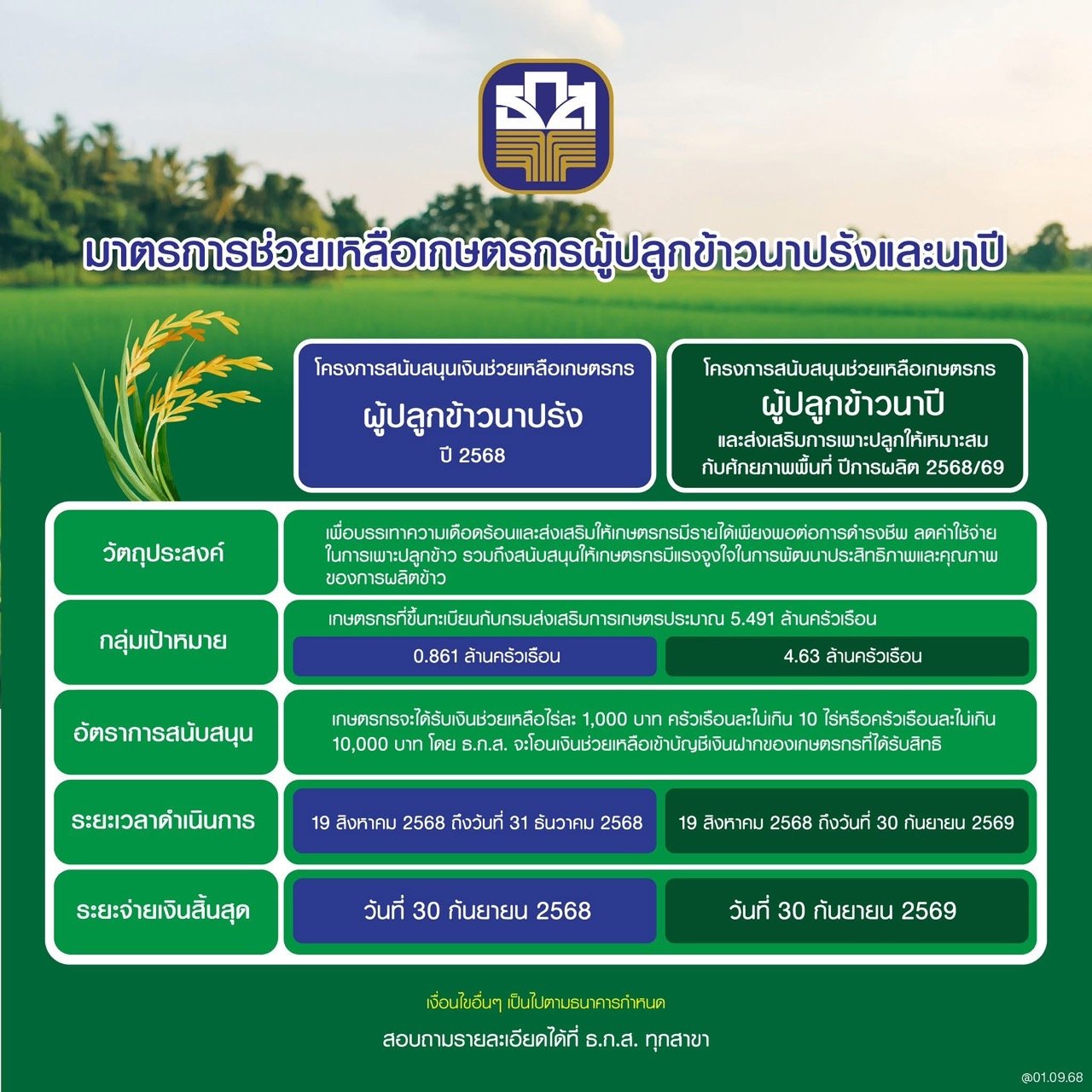 หลังจาก คณะรัฐมนตรี (ครม.) เมื่อวันที่ 19 สิงหาคม 2568 และที่ประชุมคณะกรรมการ ธ.ก.ส. เมื่อวันที่ 28 สิงหาคม 2568 มีมติเห็นชอบให้ ธนาคารเพื่อการเกษตรและสหกรณ์การเกษตร (ธ.ก.ส.) ดำเนินโครงการสนับสนุนเงินช่วยเหลือเกษตรกรผู้ปลูกข้าวนาปรัง ปี 2568 และโครงการสนับสนุนช่วยเหลือเกษตรกรผู้ปลูกข้าวนาปีและส่งเสริมการเพาะปลูกให้เหมาะสมกับศักยภาพพื้นที่ ปีการผลิต 2568/69 จำนวนรวมกว่า 4.63 ล้านครัวเรือน