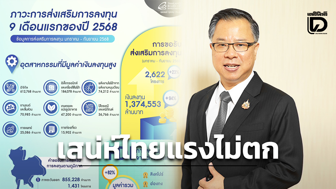นายนฤตม์ เทอดสถีรศักดิ์ เลขาธิการคณะกรรมการส่งเสริมการลงทุน (บีโอไอ) เปิดเผยว่า แนวโน้มการลงทุนในไทยในปี 2568 เติบโตอย่างต่อเนื่อง โดยช่วง 9 เดือน (ม.ค.-ก.ย. 2568) มีการยื่นขอรับการส่งเสริมการลงทุนเพิ่มขึ้นอย่างชัดเจน ทั้งในแง่จำนวนโครงการและเงินลงทุน โดยมีจำนวน 2,622 โครงการ เพิ่มขึ้นร้อยละ 23 เมื่อเทียบกับช่วงเดียวกันของปีก่อน มูลค่าเงินลงทุนรวม 1,374,553 ล้านบาท เพิ่มขึ้นร้อยละ 94 สะท้อนว่านักลงทุนให้ความเชื่อมั่นต่อประเทศไทย ทั้งด้านปัจจัยพื้นฐานที่แข็งแกร่ง ความพร้อมรองรับการลงทุน ศักยภาพการเติบโตในระยะยาว รวมทั้งบทบาทของไทยในการเป็นศูนย์กลางการลงทุนที่สำคัญในภูมิภาคอาเซียน
