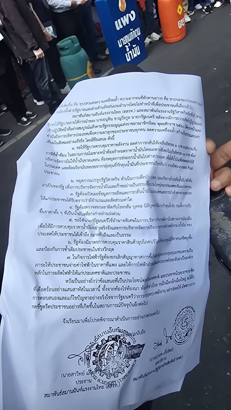 03:26กลุ่มสมาพันธ์สมานฉันท์แรงงานไทย พร้อมด้วย สมาพันธ์แรงงานรัฐวิสาหกิจสัมพันธ์ และ เครือข่ายภาคประชาชน ร่วมกันยื่นหนังสือถึงรัฐบาลให้เร่งแก้ปัญหาวิกฤตพลังงาน ที่ส่งผลกระทบถึงราคาสินค้าอุปโภคบริโภควันนี้ (2 เม.ย.2569) ตัวแทนกลุ่มสมาพันธ์สมานฉันท์แรงงานไทย (สสรท.) นำโดย นายสาวิทย์ แก้วหวาน ประธาน สสรท. ร่วมกับ สมาพันธ์แรงงานรัฐวิสาหกิจสัมพันธ์ (สรส.) และเครือข่ายภาคประชาชน ประมาณ 120 คน. เดินทางมาทำกิจกรรม และยื่นหนังสือถึง นายอนุทิน ชาญวีรกูล นายกรัฐมนตรี และ รมว.มหาดไทย ให้เร่งแก้ปัญหาวิกฤตน้ำมันขาดแคลน ส่งผลต่อการใช้ชีวิต และมีผลทำให้สินค้า และค่าไฟฟ้า สูงขึ้น